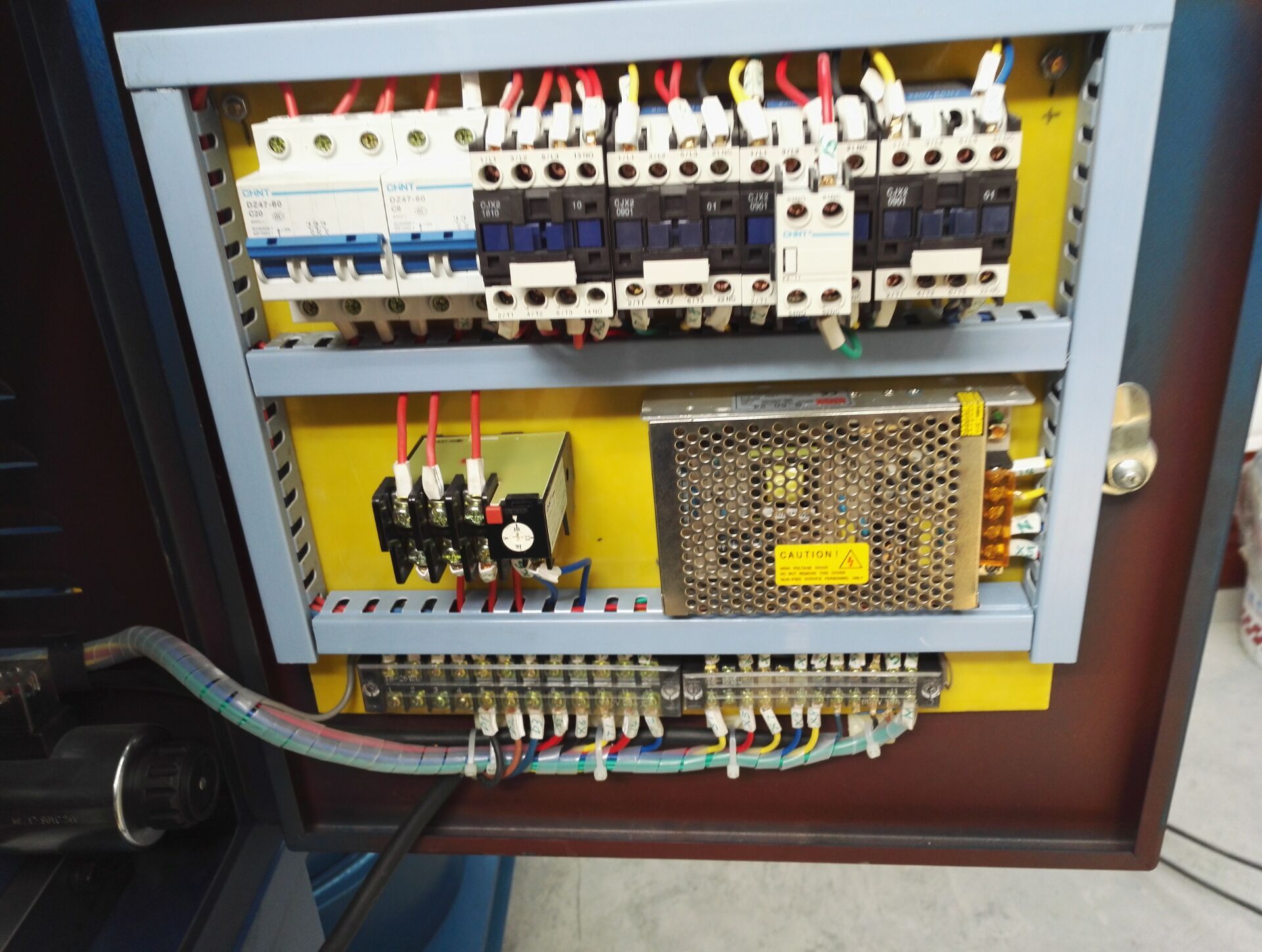 3、在電機(jī)啟動(dòng)后,按下“點(diǎn)動(dòng)上升”按鈕下模上升,松開“點(diǎn)動(dòng)上升”按鈕下模停止上升,按下“點(diǎn)動(dòng)下降”按鈕下模下降,松開“點(diǎn)動(dòng)下降”按鈕下模停止下降。